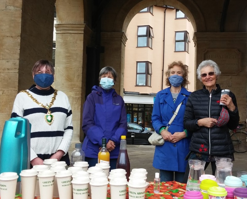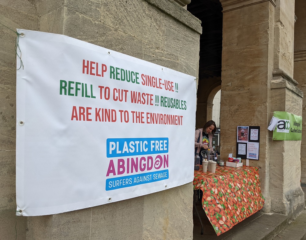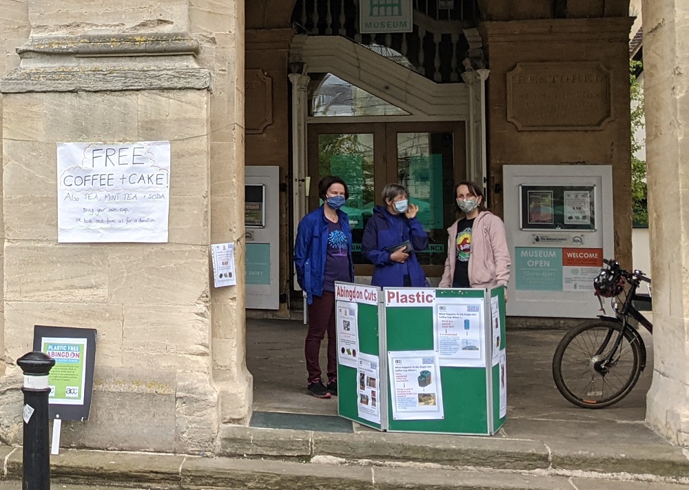 Many people turned up with their reusable cups and were rewarded with free coffee and cake. We also gave out all 80 of the reusable mugs, which were 20 we bought from Oxfam, 10 generously donated by Waitrose, and 50 made for the Town Council.